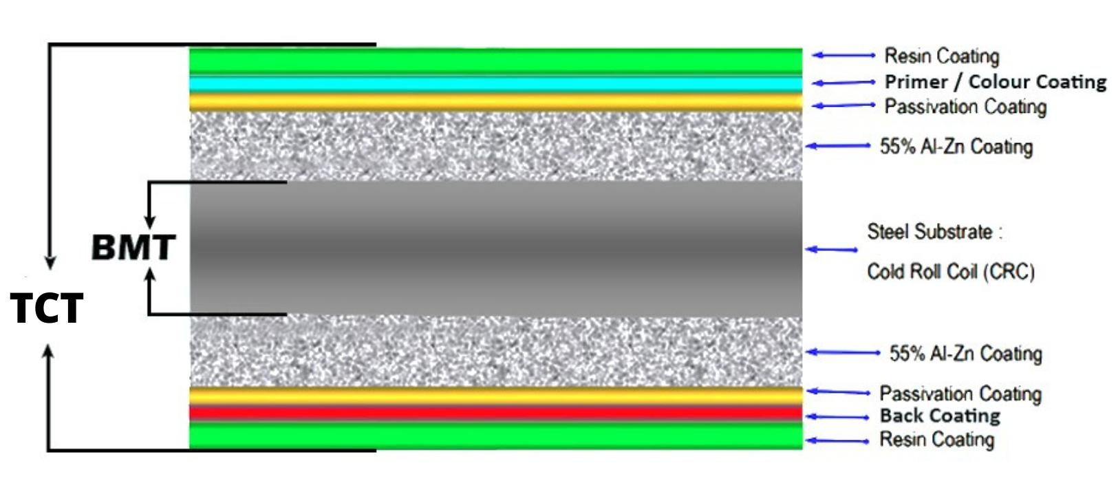 Sedangkan TCT adalah kepanjangan dari Total Coating Thickness merupakan ukuran ketebalan yang mencakup lapisan-lapisan dari baja ringan seperti lapisan logam, resin ataupun cat.